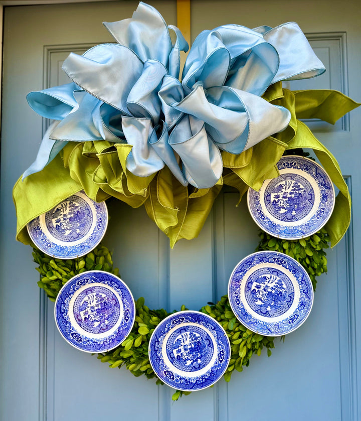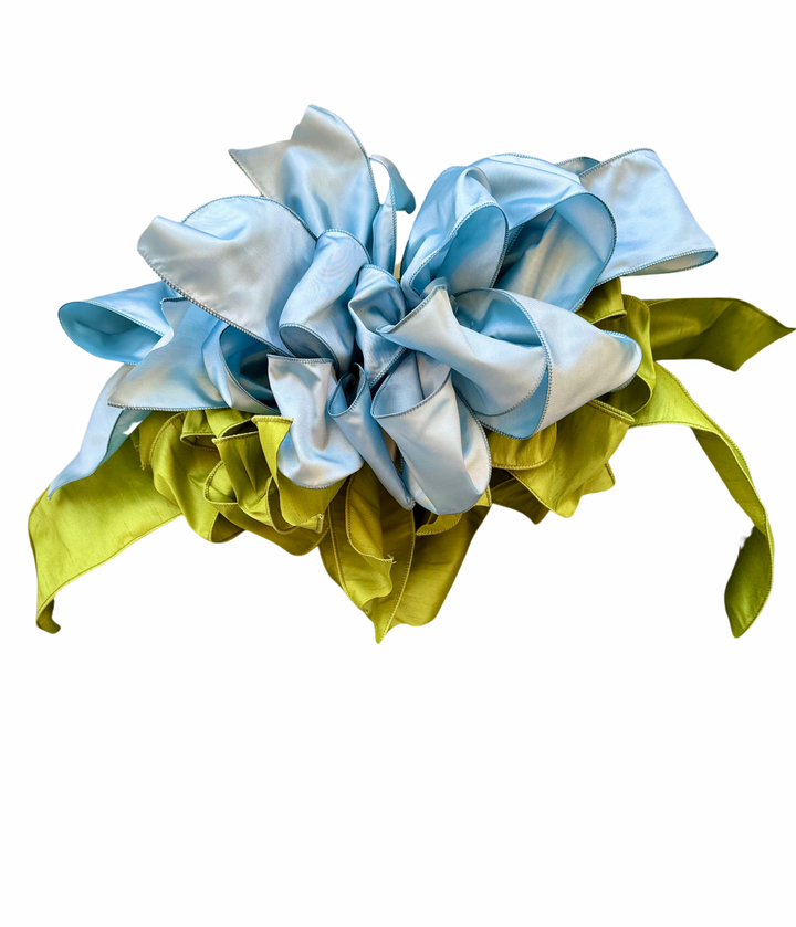 Large 28 inch double-decker triple hand tied bow and two gorgeous colors that give coastal vibes. Every bow is packed with love and care and suspended in its box to avoid damage and transit shipping is included. This is made with 4 inch ribbon and uses 10 yards.