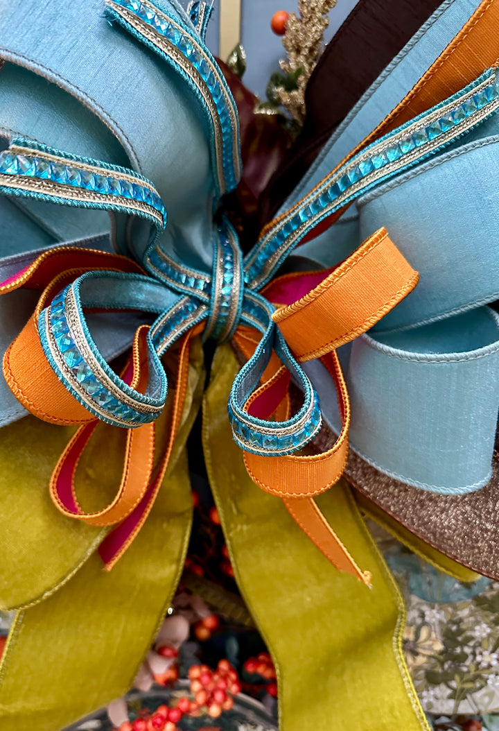 Elevate your seasonal décor with this 24 inch designer bow inspired by the artistry of William Morris. Hand-tied with layered velvet ribbon in rich autumn shades of chartreuse, chocolate, turquoise, orange, and fuchsia, this bow is a statement piece all on its own. Perfect for dressing up your front door, wreaths, mantels, mirrors, or holiday tablescapes, it brings heritage charm and bold color to any space. Crafted with heirloom quality detail, this limited edition bow is designed to stand out for fall and beyond.
