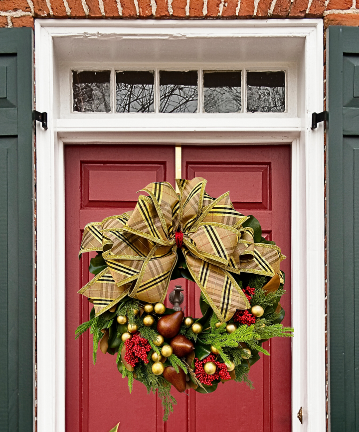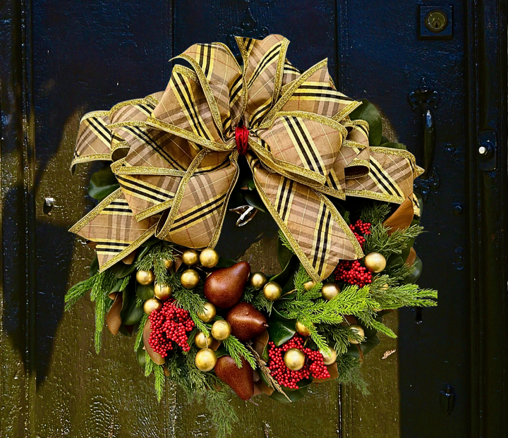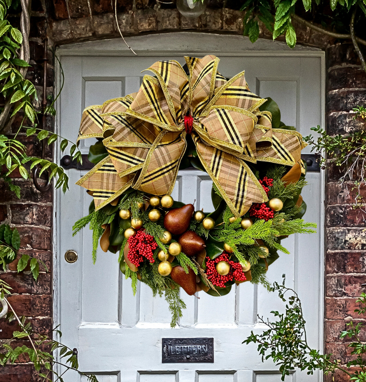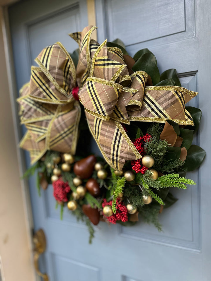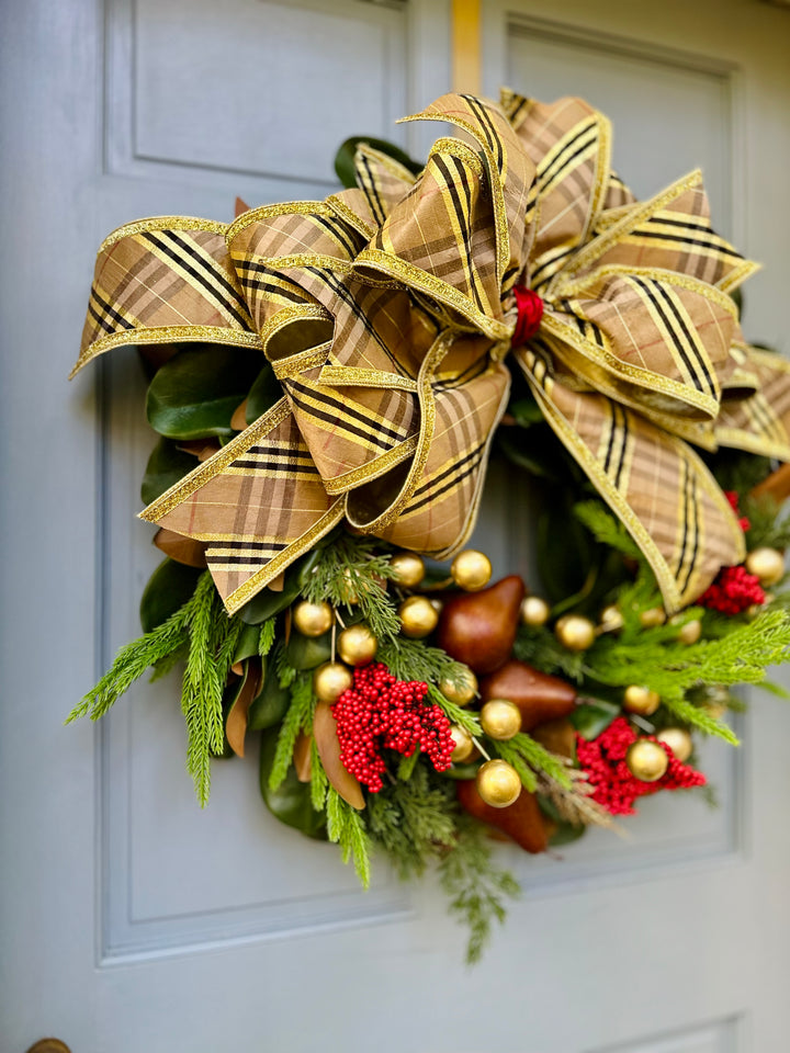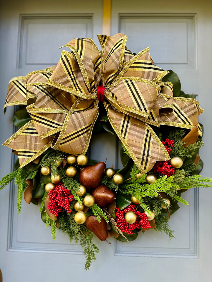 This 28” magnolia wreath blends timeless British charm with Southern elegance. Featuring glossy magnolia leaves, red berries, cedar and Norfolk pine, golden pears, and muted gold ornaments — all crowned with our signature Burberry-inspired plaid bow. A refined statement of heritage luxury for the season.