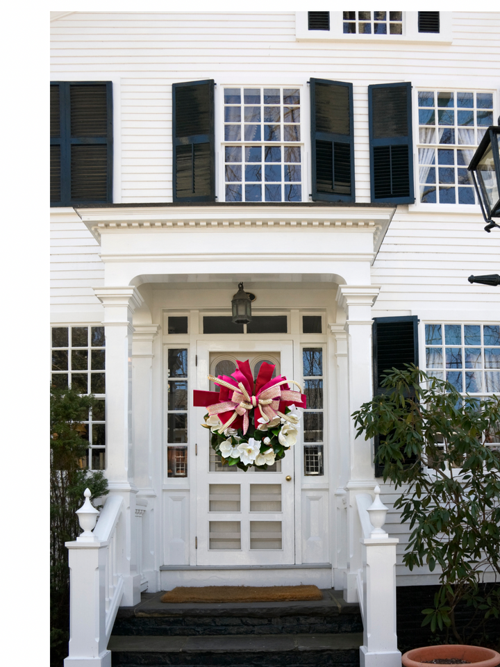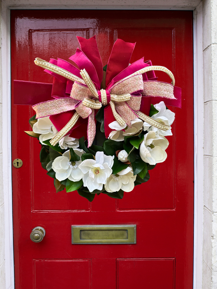 meet the Chanel for Jackie O Magnolia wreath. A very full 30 inch lush magnolia wreath in bloom. Wreath is 10 inches deep finished and tied with a luxurious lush velvet hot pink tweed, and Chanel pearls bow this stunning Wreath is sure to make your front door the best in the neighborhood.