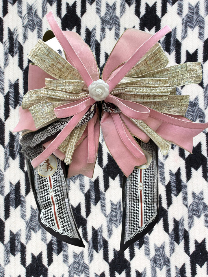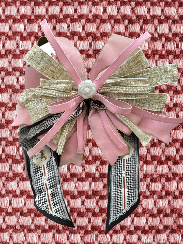 Our 24” Chanel-Inspired Couture Bow is the ultimate statement piece for doors, mantels, or holiday décor. Hand-tied with blush velvet, pearl-accented tweed, and finished with a camellia center, this bow embodies Parisian couture style with Southern sophistication. Whether styled alone or paired with a magnolia wreath, it’s a collector-worthy accent for any Chanel lover.