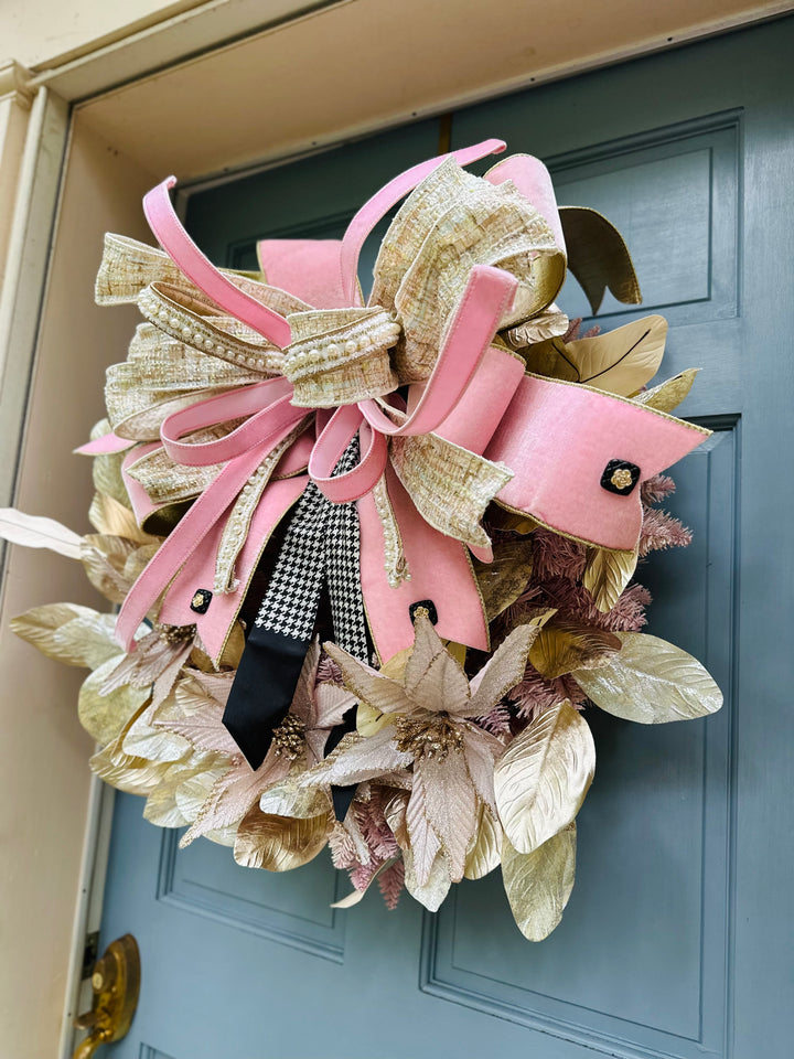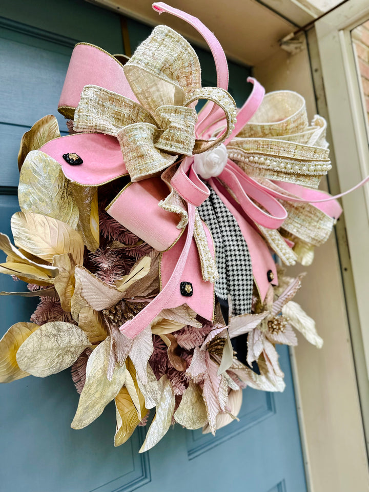 Hand tied wreath base in a light pink hue with rose gold florals and and magnolia leaves giving a super vintage vibe.