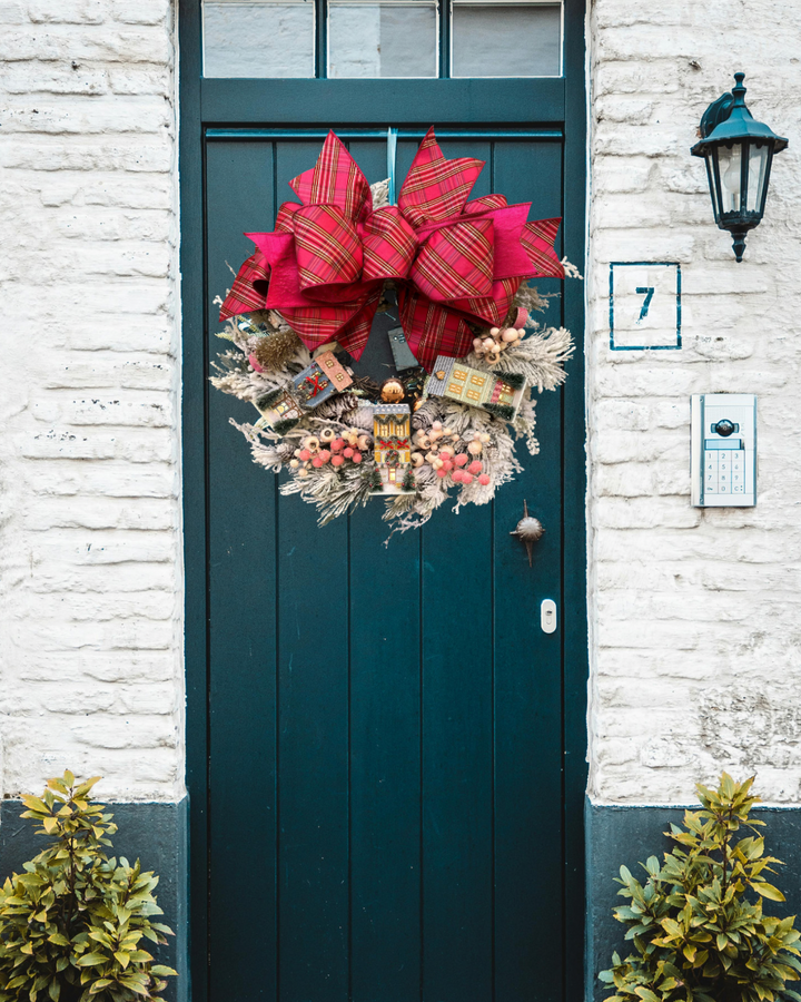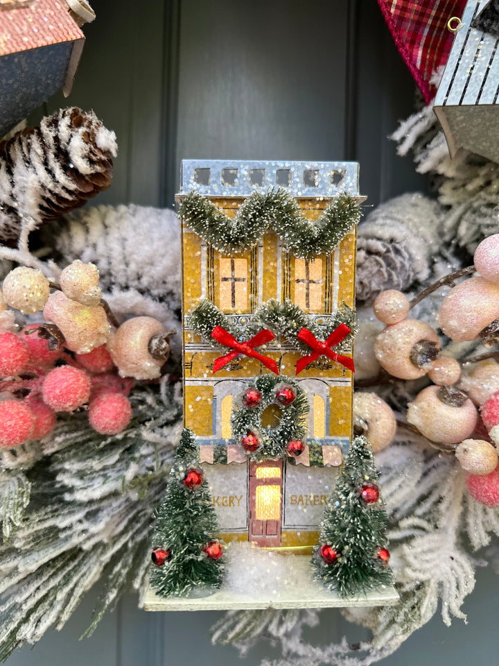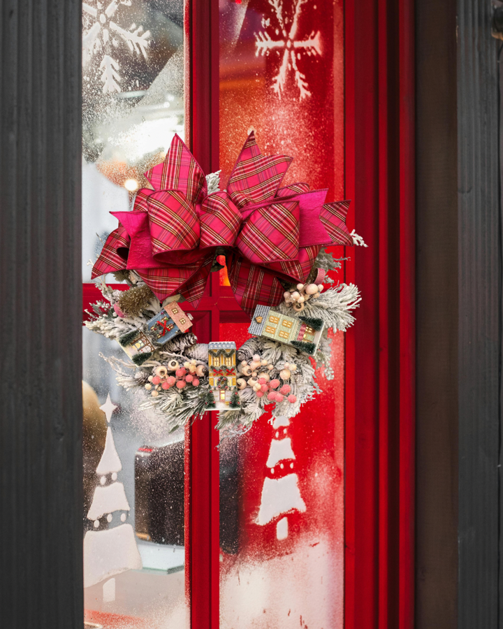 Light up snowy Townhouses decorated for the season bring this wreath to life especially when turned on. Imagine the nostalgia of walking down a city side street with lights aglow through frosty window panes. Snow covered wonderland with a raspberry plaid hand tied bow to crown this one. 24” indoor wreath. Battery operated houses batteries included.