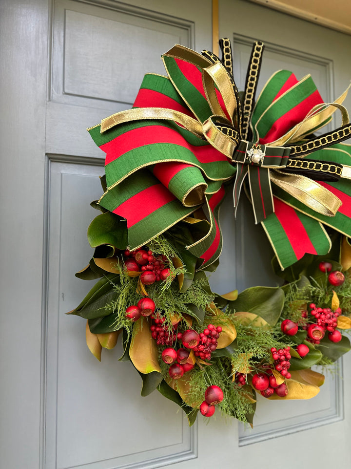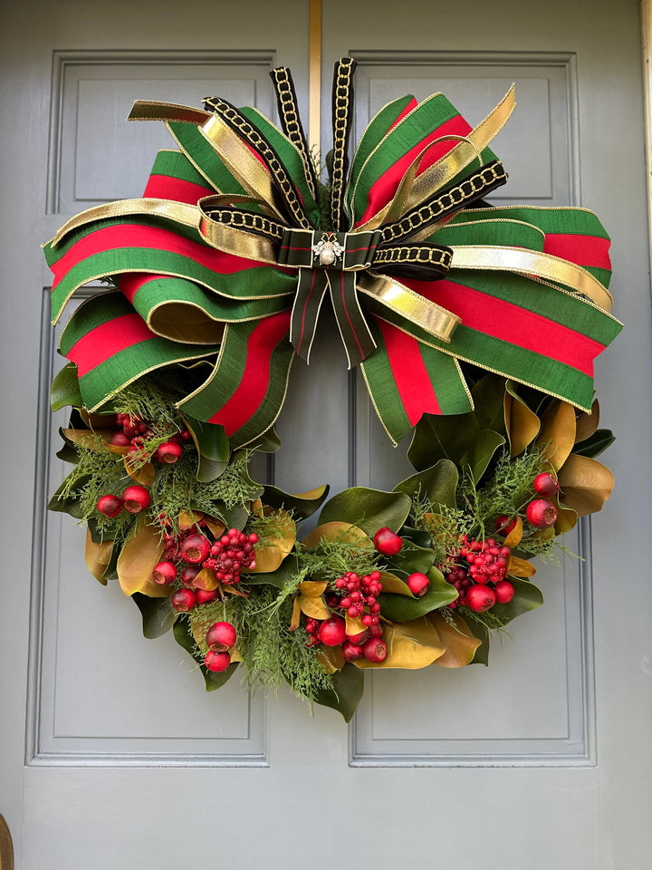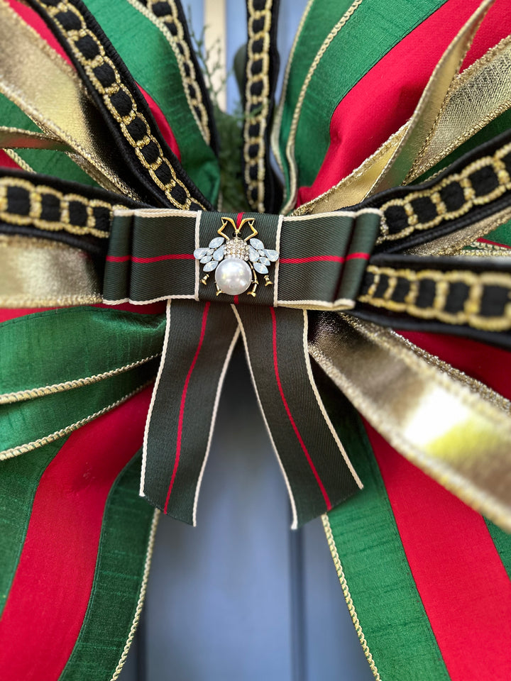 From our exclusive Designer Capsule Collection, this Gucci-inspired holiday wreath is pure *la dolce vita*. Bold emerald green, ruby red, and luxe gold ribbons crown a lush magnolia and berry base, finished with a couture bee brooch at the center. A statement piece that channels the iconic elegance of the Gucci maison — festive, fashion-forward, and utterly italiano.