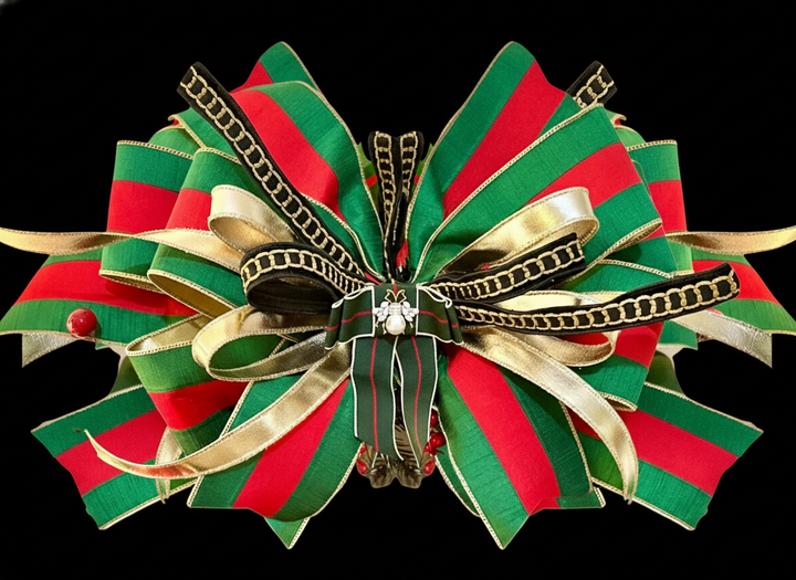 Where high fashion meets holiday. Bold red and green stripes, glossy gold trim, and luxe black chain-edge ribbon come together around a jeweled bee brooch — the unmistakable nod to iconic Italian design.