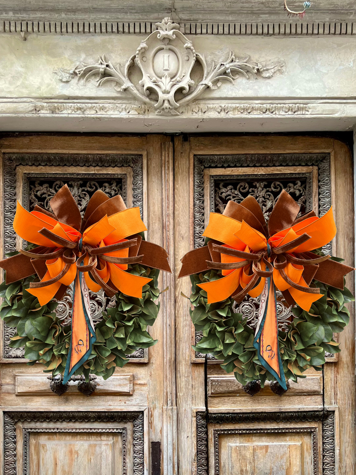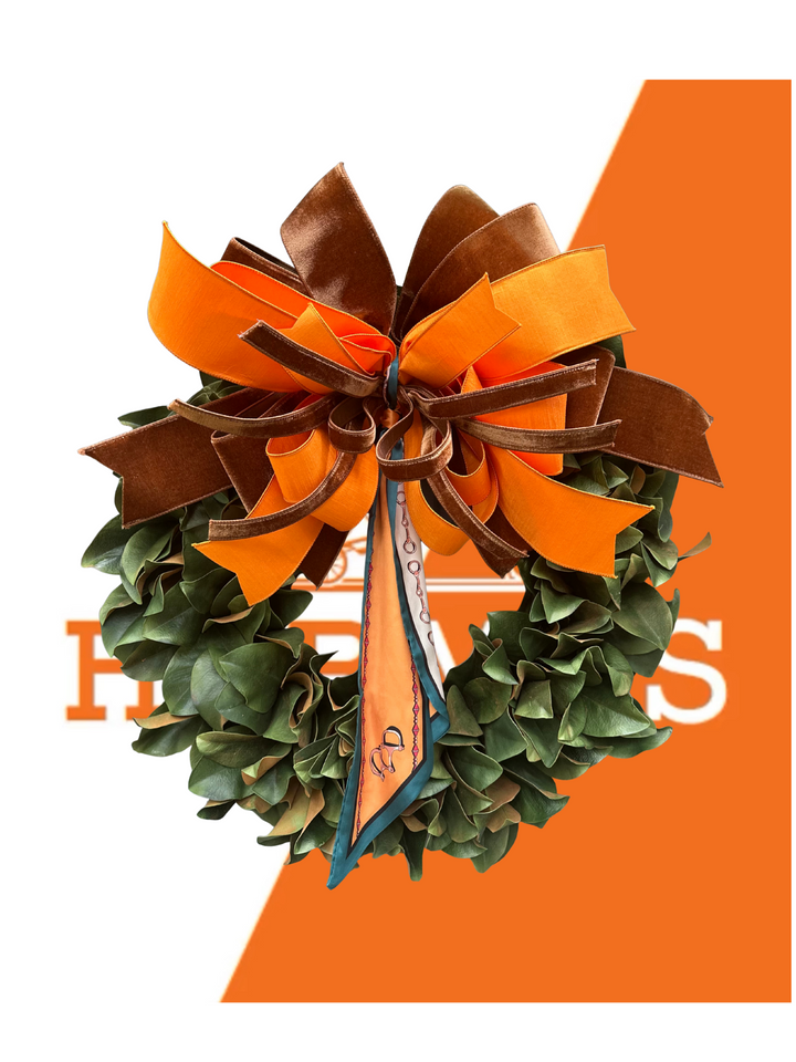 A true statement piece for the season. This 32 inch magnolia wreath is crafted on our new premium magnolia, renowned for heirloom-quality forever botanicals. Luxe orange and chocolate velvet ribbons pair with a couture scarf drape in a nod to Hermès’ iconic equestrian heritage.