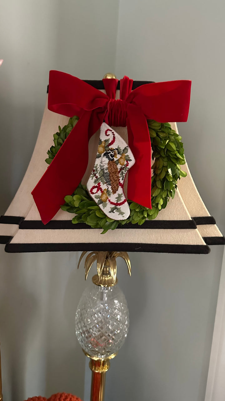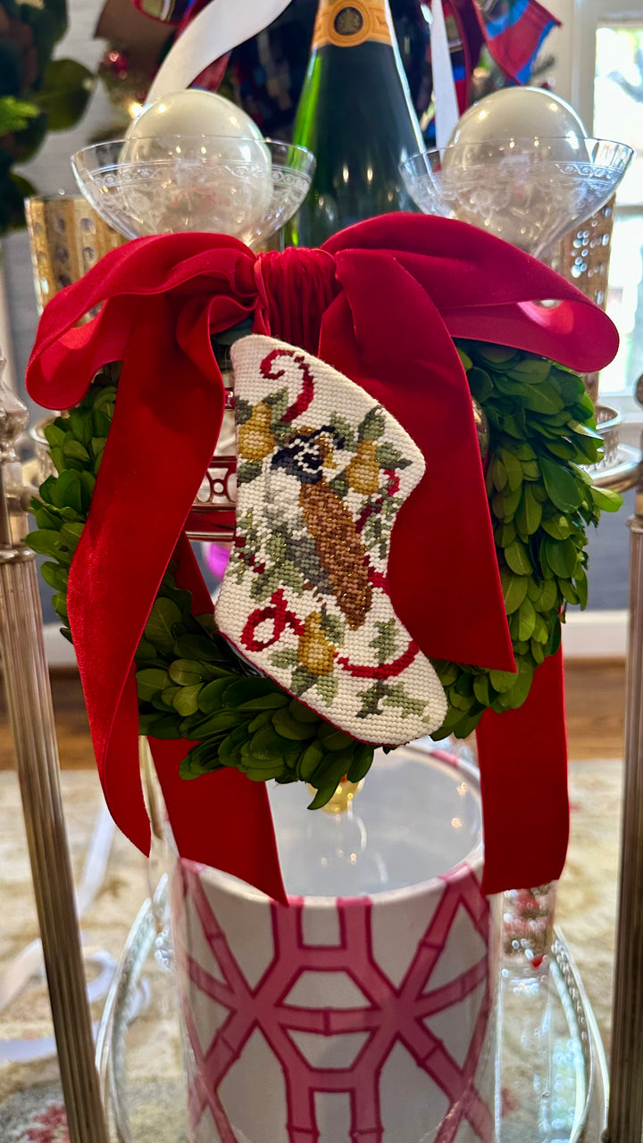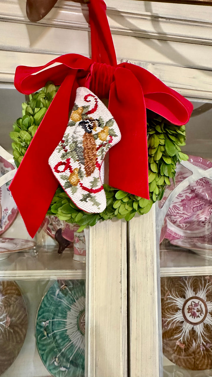Our 8" preserved boxwood wreath is dressed in a Partridge in a Pear Tree needlepoint stocking and finished with a red velvet bow. Each piece is artfully tied and ready to hang — the perfect touch for chair backs, china cabinets, lamps, or a bottle of your favorite champagne.