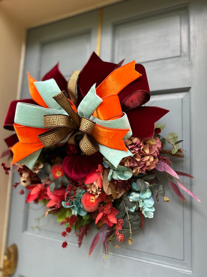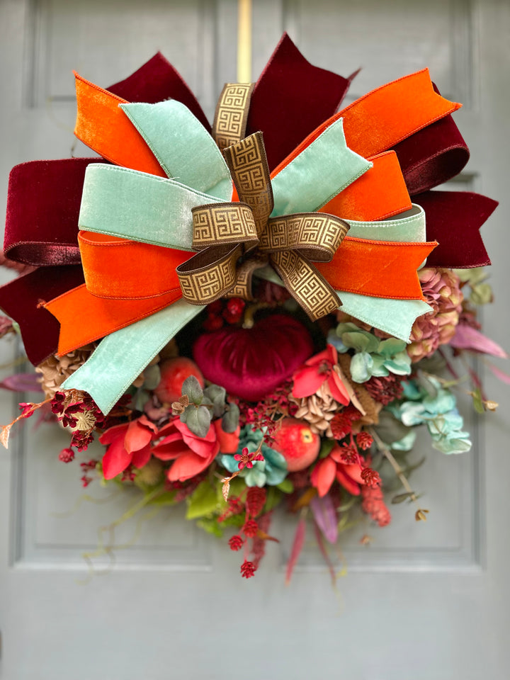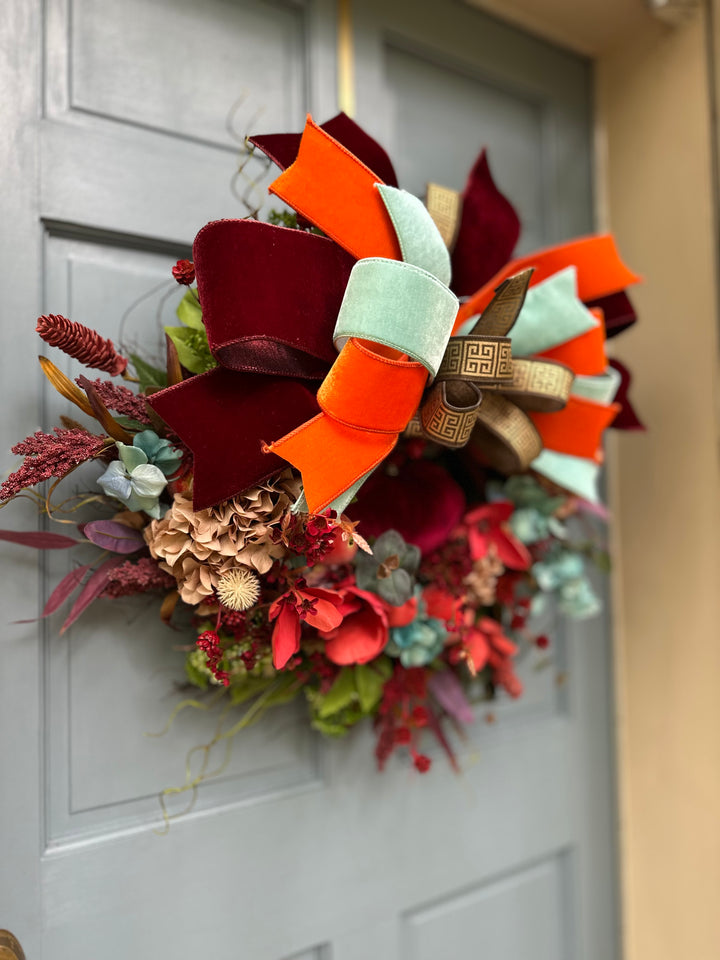 Pomona’s Table celebrates abundance and artistry in every detail. Deep crimson and persimmon tones mingle with mint velvet and gilded accents, creating a rich, painterly wreath that feels both timeless and couture. Inspired by Pomona, the Roman goddess of fruitful gardens, this one-of-a-kind design brings warmth, sophistication, and beauty to any entryway or interior.