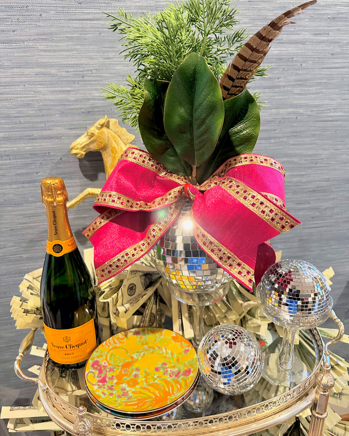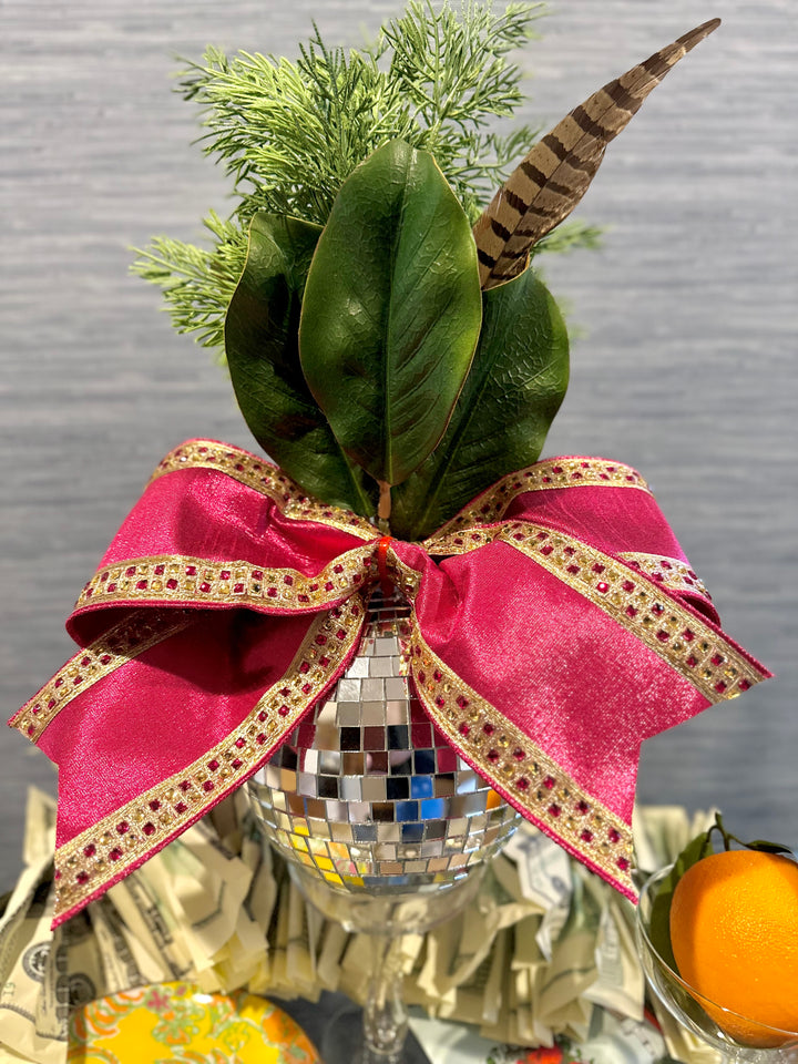 Mirrored 6” Disco ball with 2 magnolia sprigs cedar and pheasant feather with a luxe bejeweled pink dupion hand tied bow. All faux real touch greenery and authentic 10”-12” pheasant feather. 14”x6”x6” Shipping included.