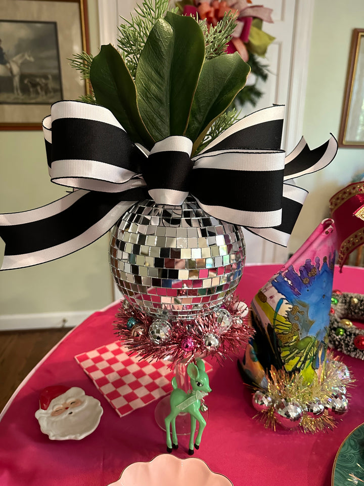 Southern preppy disco ball ! These are so much fun features a 6 inch disco ball with a chic black-and-white stripe grosgrain ribbon bow. Features a three leaf magnolia sprig and a cedar sprig. Includes shipping 20x6x6 these make great holiday decor items to hold place cards. Add to your centerpiece hang on your tree. They are great conversation pieces.
