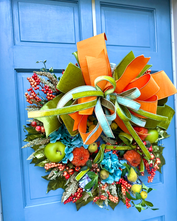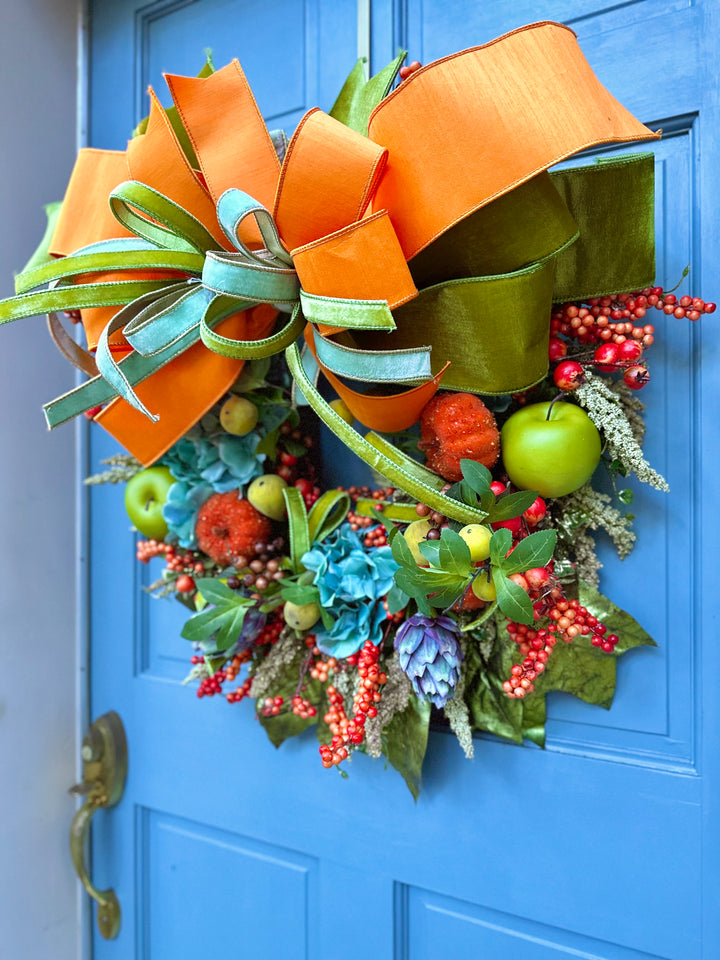 This 24 inch one-of-a-kind fall wreath brings together the sparkle and abundance of the harvest season. Designed with shimmering amaranth, sugared pumpkins, crisp green apples, figs and lush teal hydrangeas, backed by foiled green oak leaves. It is full of rich texture and color.