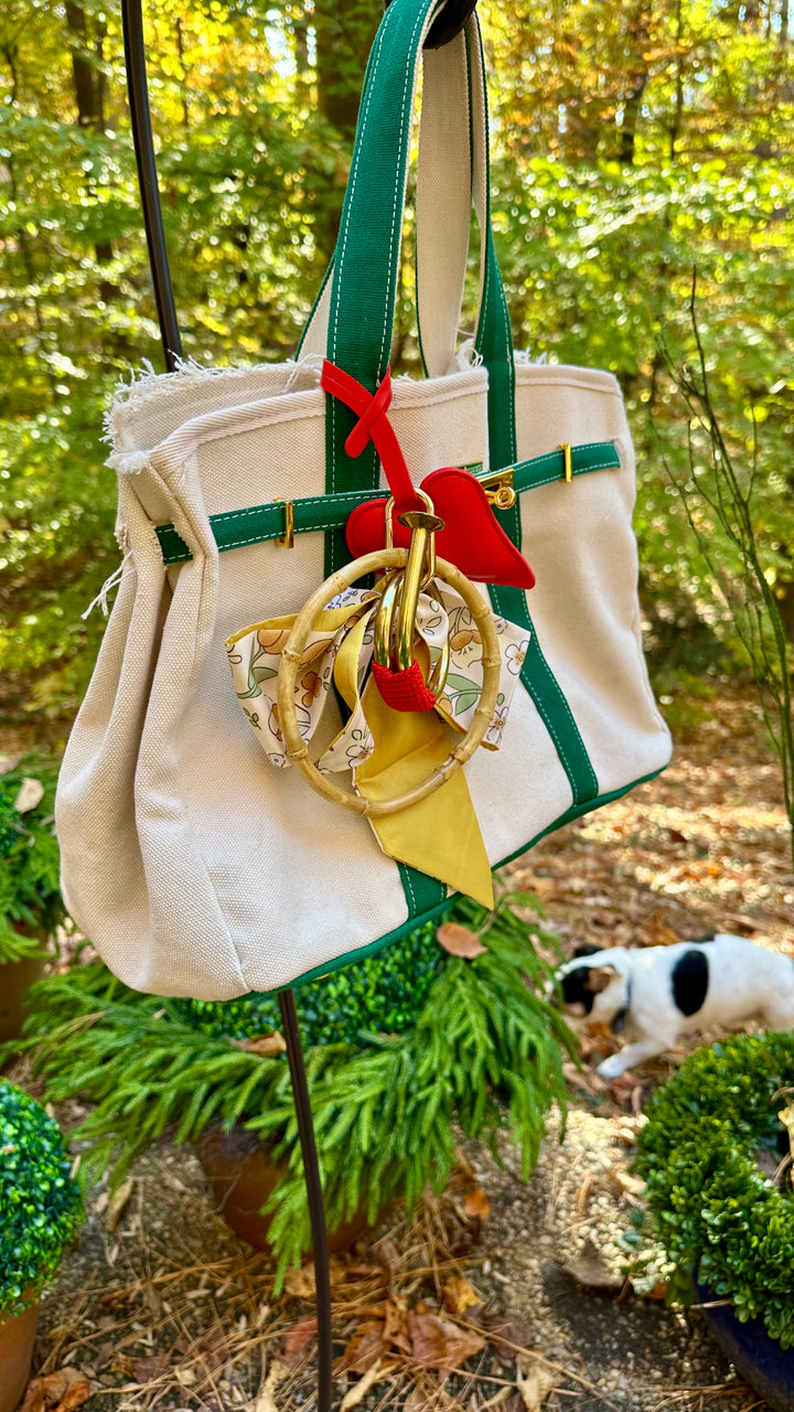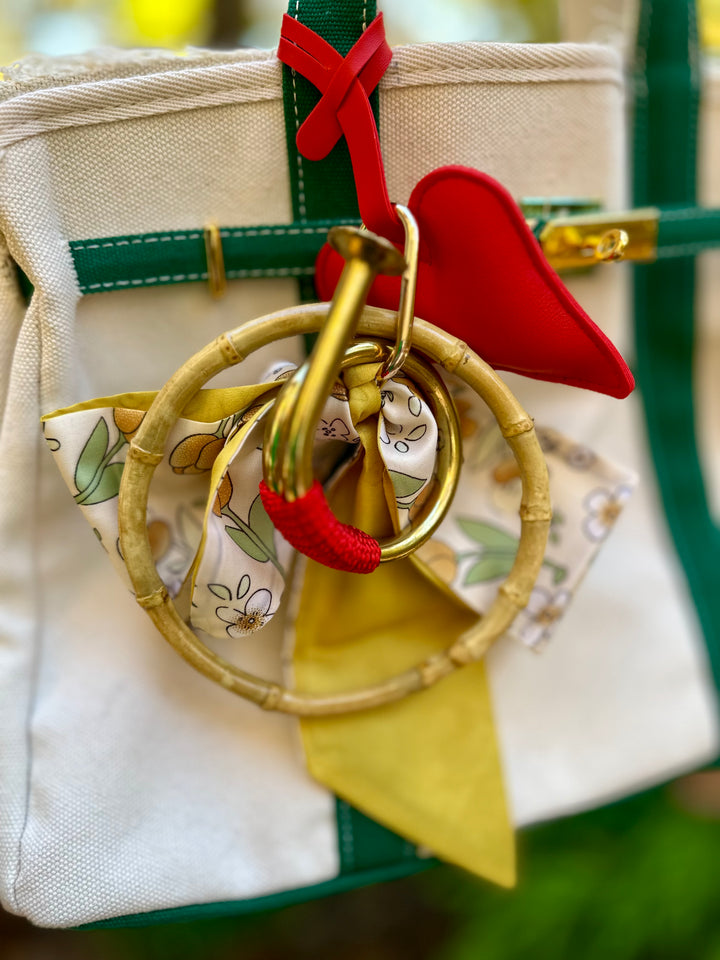 Always anchored by the signature bamboo ring and gleaming hunt horn, this charm brings a burst of sunshine with a cheerful floral twilly and bright ribbon wrap with leather like heart and coordinating horn wrap. Fresh, fun, and full of personality — it instantly lifts any bag and makes the sweetest holiday gift.