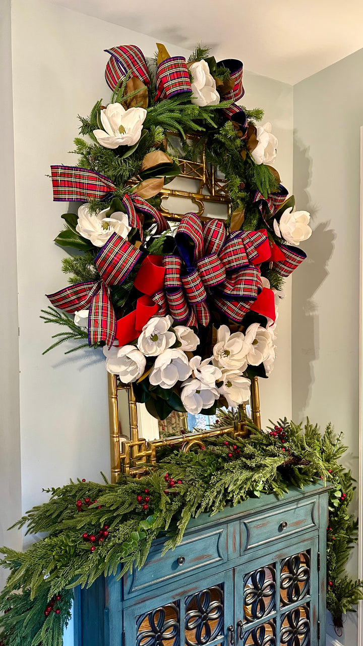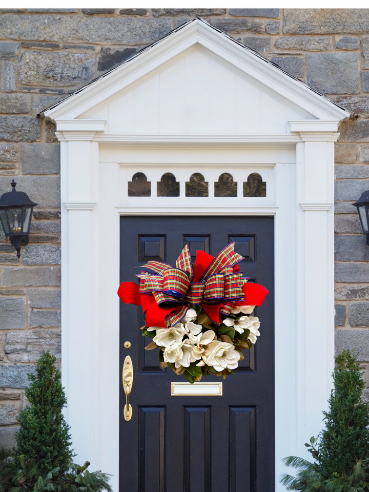 The Sweet Bay Plaid Magnolia Wreath by Wellbourne Table celebrates the season with the elegance of creamy magnolias and the cheerful charm of holiday plaid. Hand-crafted on a lush magnolia base and crowned with a generous red-and-plaid bow, this wreath captures the warmth of a Southern Christmas and the spirit of tradition. Available in 24″ and 28″ sizes — a timeless accent for your front door, mantel, or holiday table.