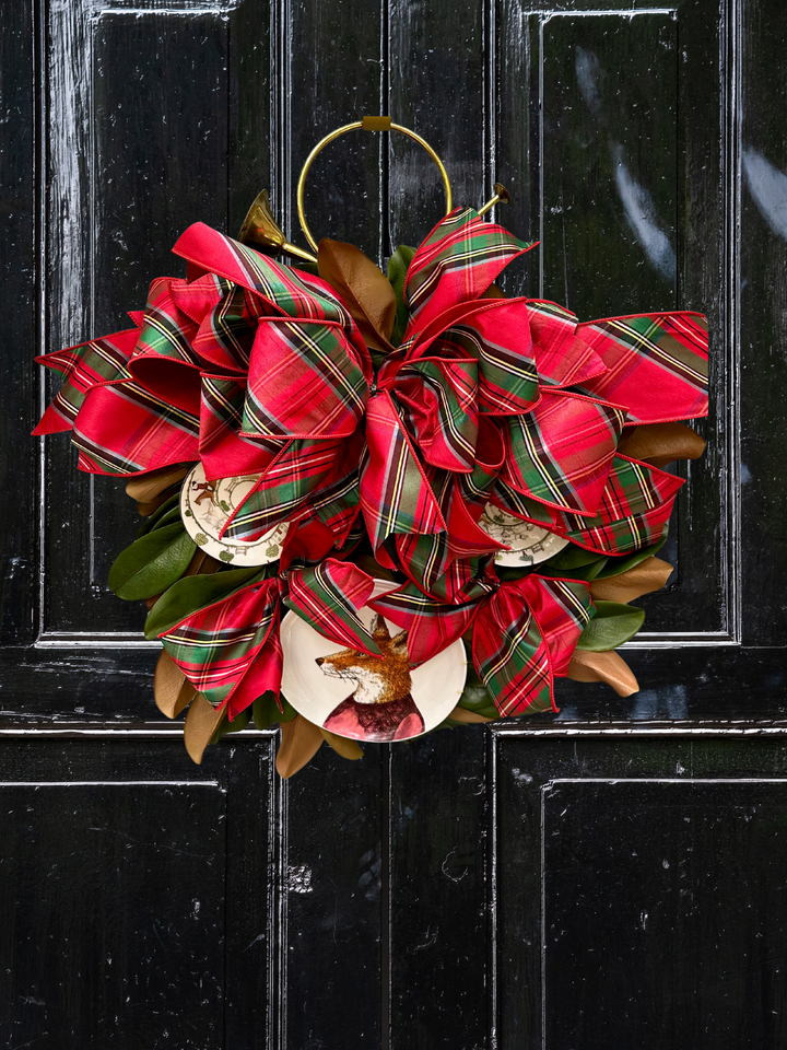 Tally Ho Virginia Hunt Country Wreath — Luxury Holiday Wreath with Antique Plates, Equestrian Style & Tartan Bows