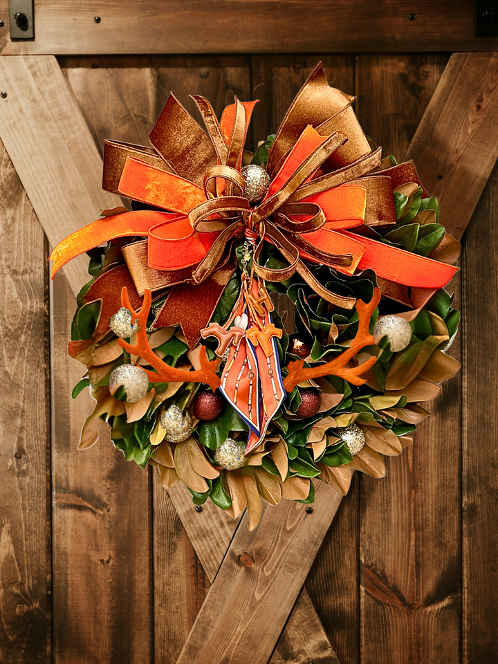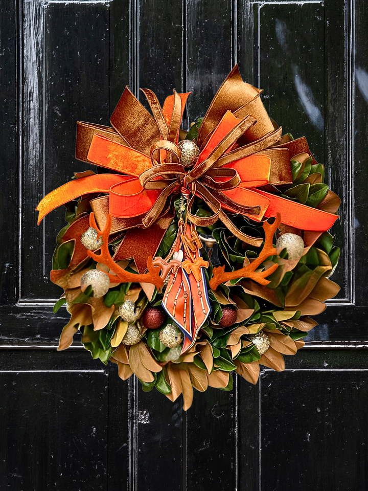 The Hermès Noël Capsule celebrates Parisian luxury and equestrian elegance reimagined for the holiday season. Each wreath is handcrafted with signature Wellbourne artistry — layers of magnolia and boxwood, velvet ribbons in the house’s iconic orange, and gilded ornaments that shimmer with quiet sophistication.