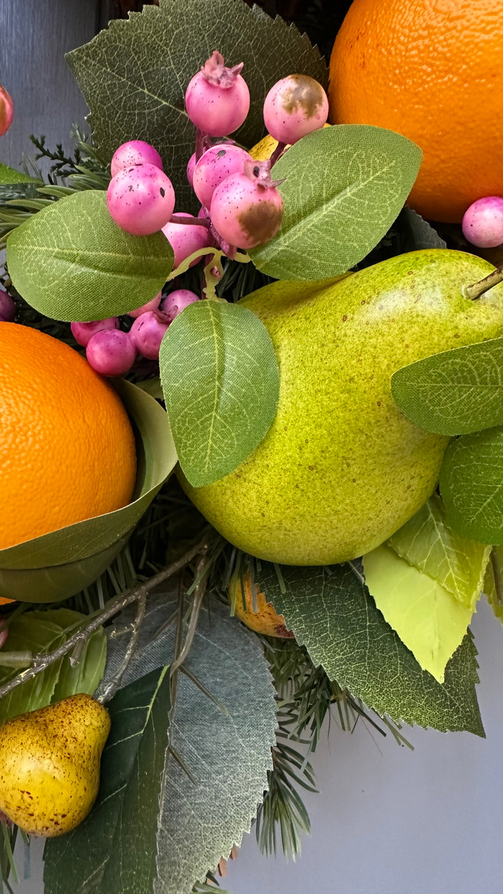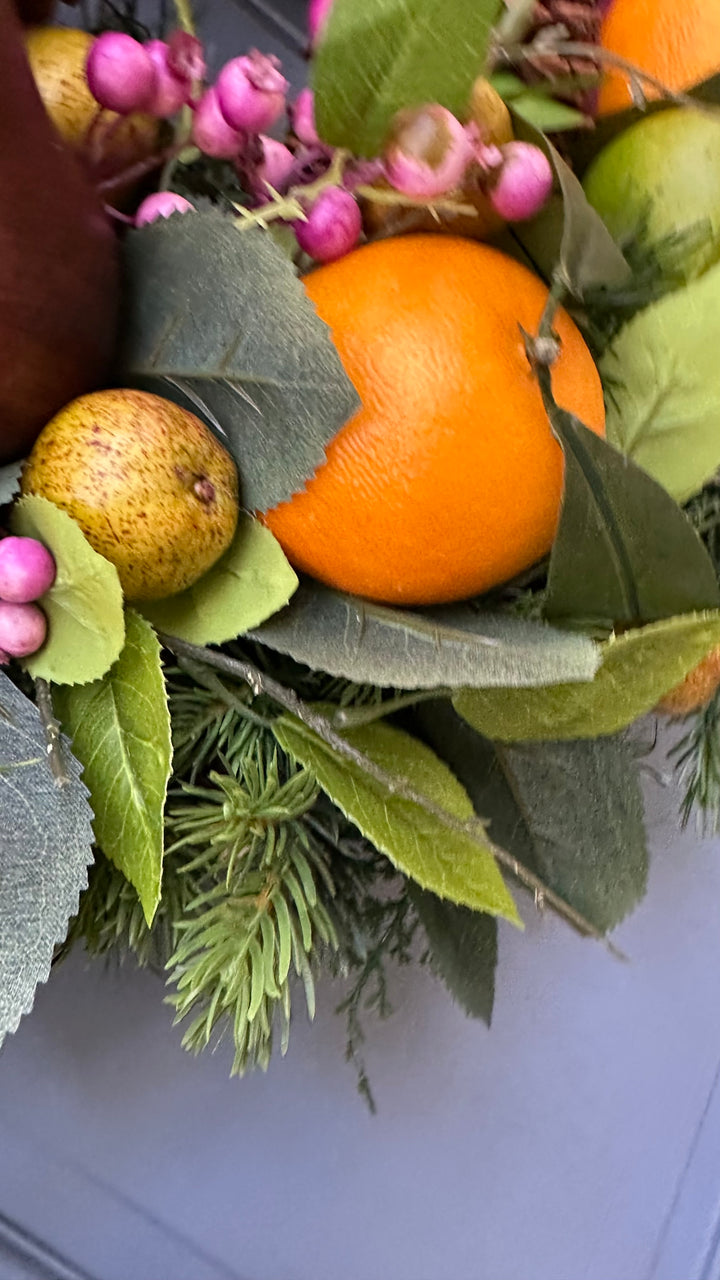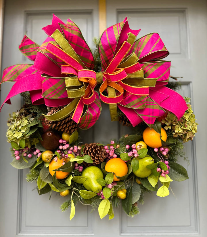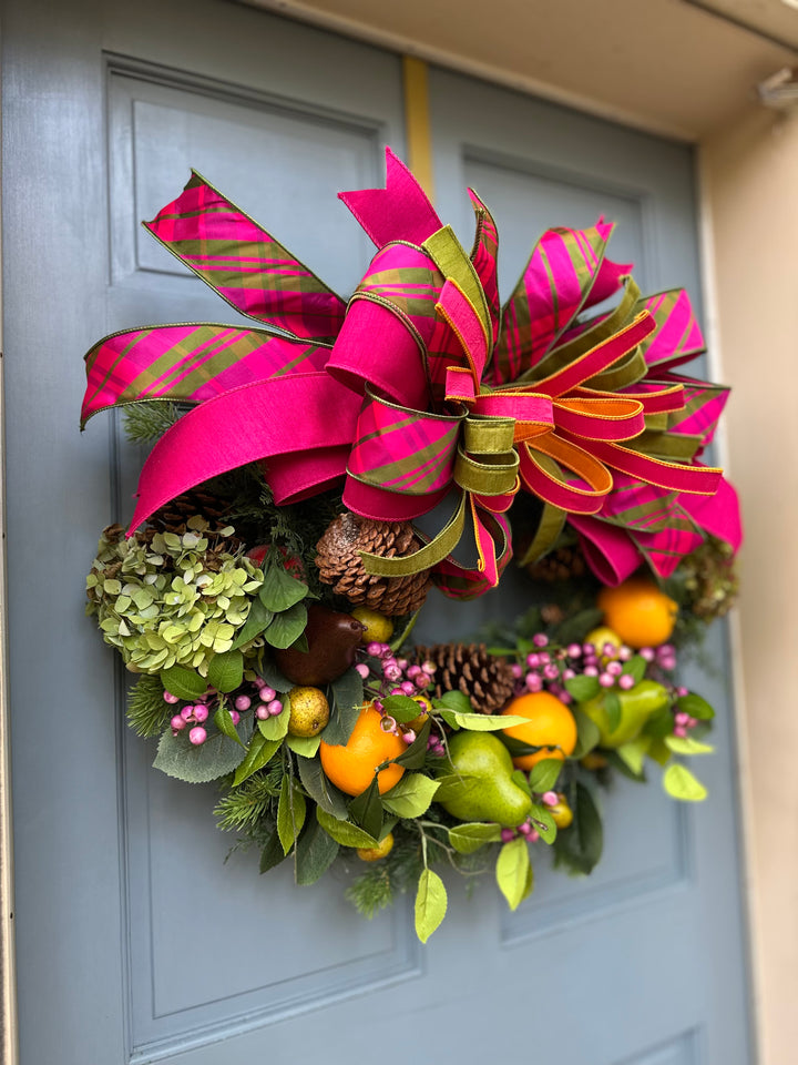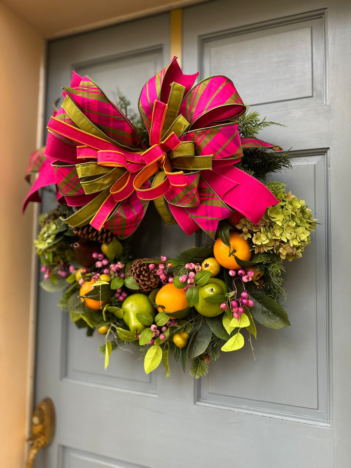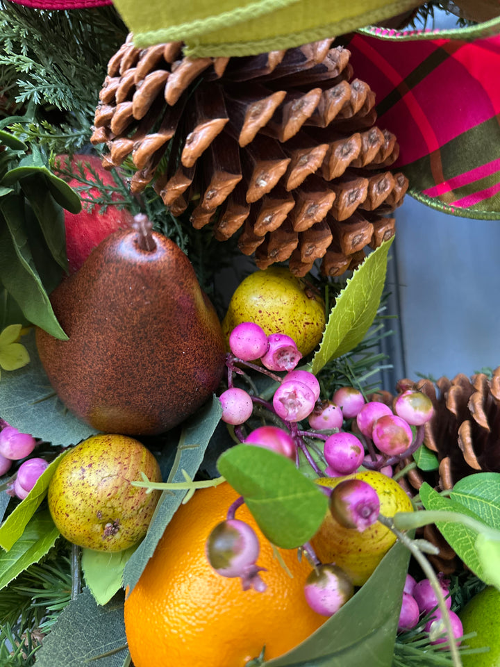 Meet “Suki.” Williamsburg—but make it cute. Inspired by my next-oldest sister, this design blends timeless Virginia tradition with playful flair. Classic colonial fruits—pears, oranges, and apples—nestle among cedar, pine, and real colonial Williamsburg pinecones, accented with pistachio cranberry plaid, and a touch of citrus sparkle. It’s cheerful, elegant, and beautifully balanced—like your sister who always brings the charm. Perfect for doors, mirrors, or dining rooms that deserve a dash of historic holiday magic with a wink of modern joy.