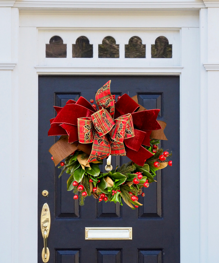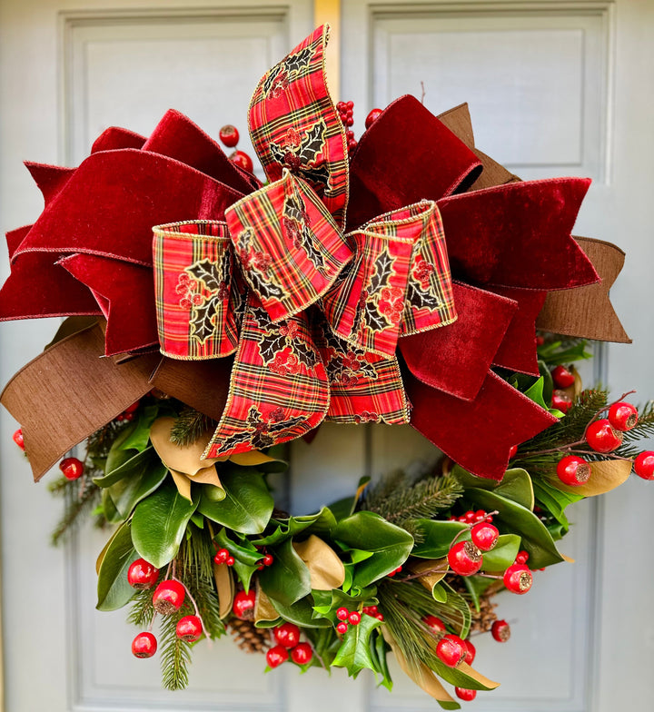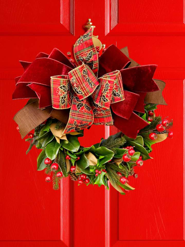 The Wesley Wreath from Wellbourne Table is a timeless holiday statement that blends family heritage with refined Southern charm. Designed in tribute to my brother, it celebrates warmth, tradition, and the quiet luxury of home at Christmastime. Layers of magnolia, pine, and glossy holly leaves and berries are finished with a deep chocolate and red velvet and holly-plaid silken bow — nostalgic, elegant, and handcrafted in Williamsburg, Virginia.
