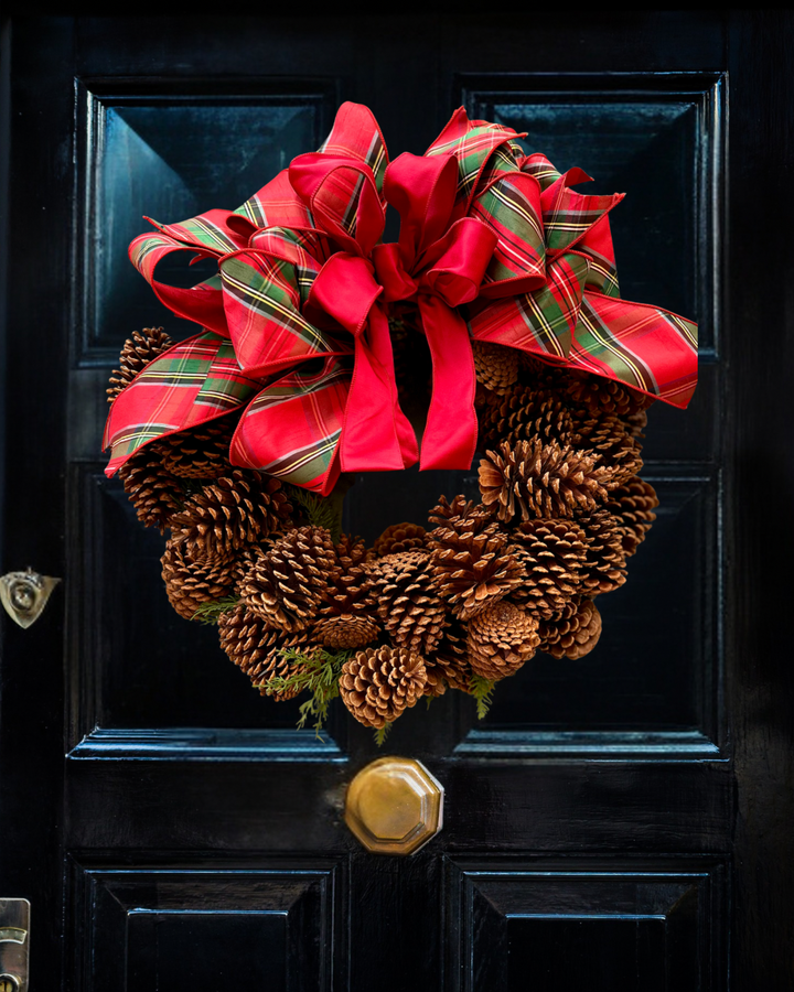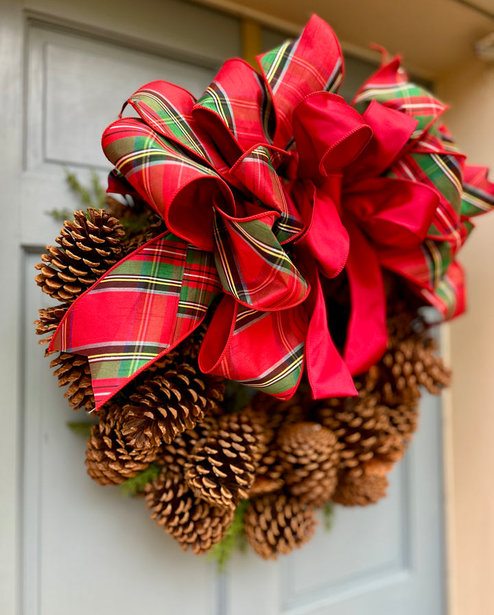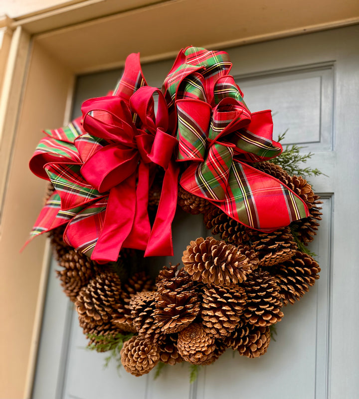 A very large classic pinecone wreath inspired by the ones my mother and I made together when I was a little girl. Crafted with rich mahogany-toned jumbo pinecones, this wreath has a beautifully textured, heirloom feel that brings instant warmth to any door or mantle.