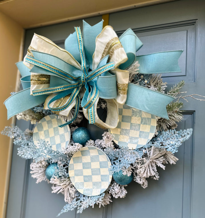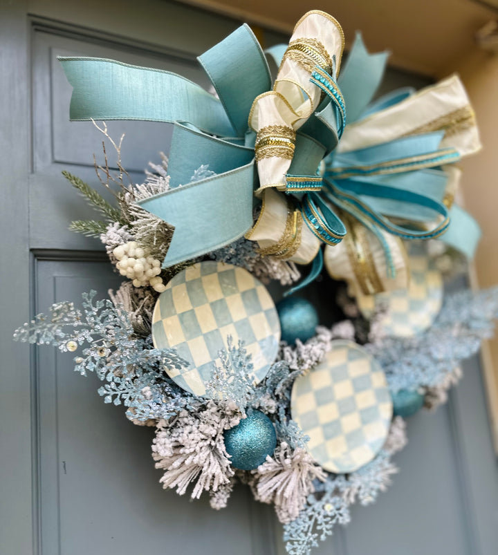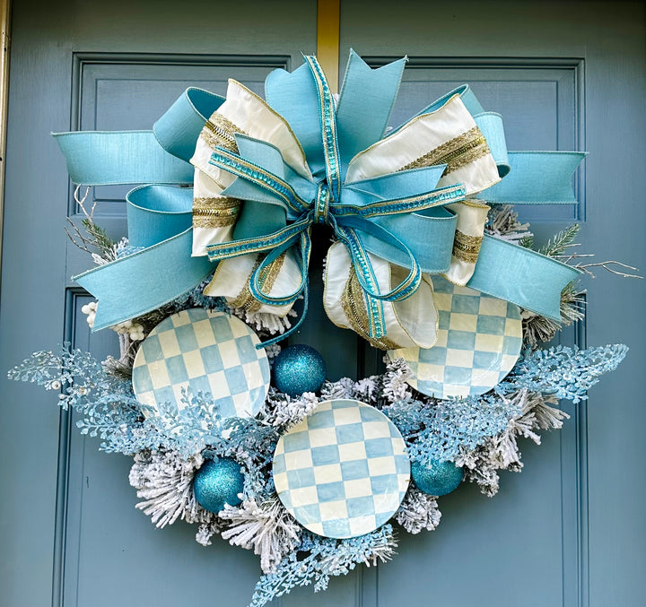 Meet “Windsor Frost.” She’s grandmillennial elegance wrapped in silk and snow. Frosted evergreens cradle blue-and-ivory check plates, shimmering baubles, and layered ribbons trimmed in gold. Think Georgian townhouse at Christmastime — timeless, preppy, and effortlessly poised. With her icy palette and polished charm, Windsor Frost is made for the girl who collects blue-and-white china, monograms everything, and knows a perfect bow is always in style and loves all things classic.